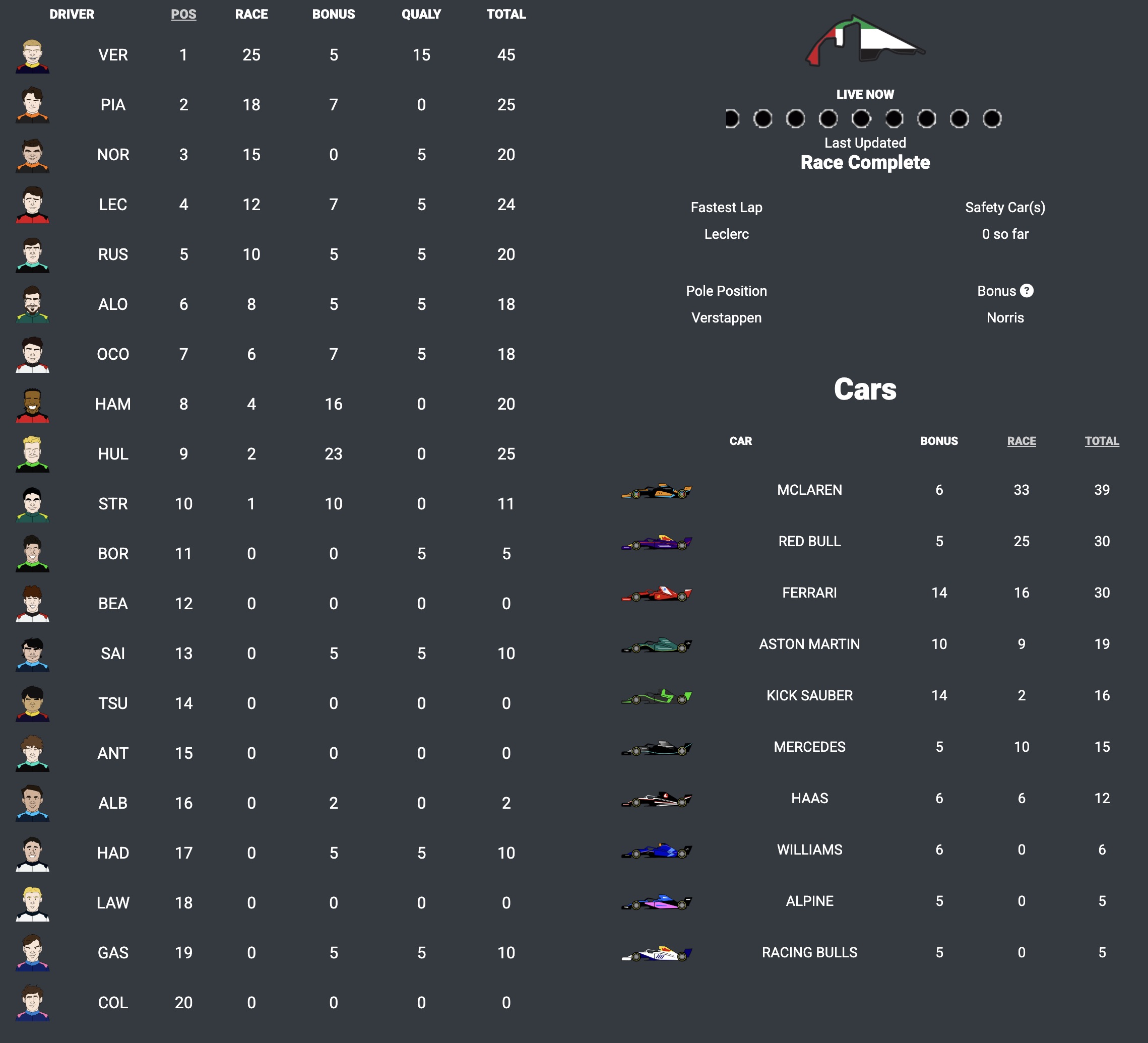 In Fantasy GP terms, we had the podium of Verstappen, Piastri and Norris with Leclerc taking the fastest lap and of course Verstappen had Pole Position. We didn’t have a single Safety Car period and for the bonus question, the answer was A) Norris, with him becoming the 35th British World Champion.