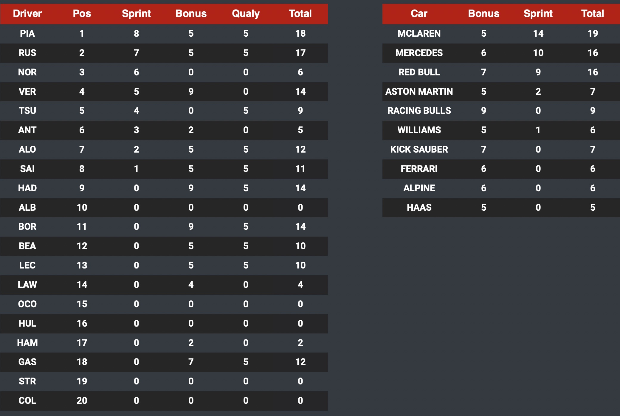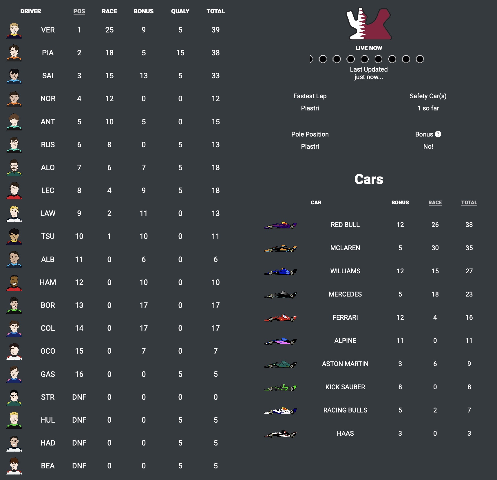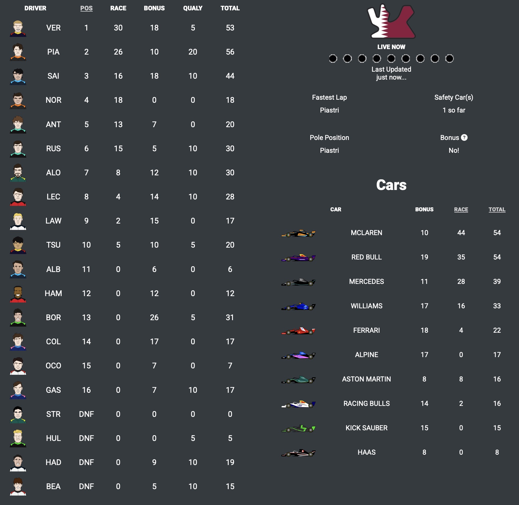 In Fantasy GP terms we had a podium of Verstappen, Piastri and Sainz with Piastri taking the fastest lap. Of course, Piatri had Pole Position and we had a total of 1 Safety Car period. For the bonus prediction, the correct answer was C, No – because Piastri won the Sprint and Verstappen won the GP, so not the same driver or the same car.