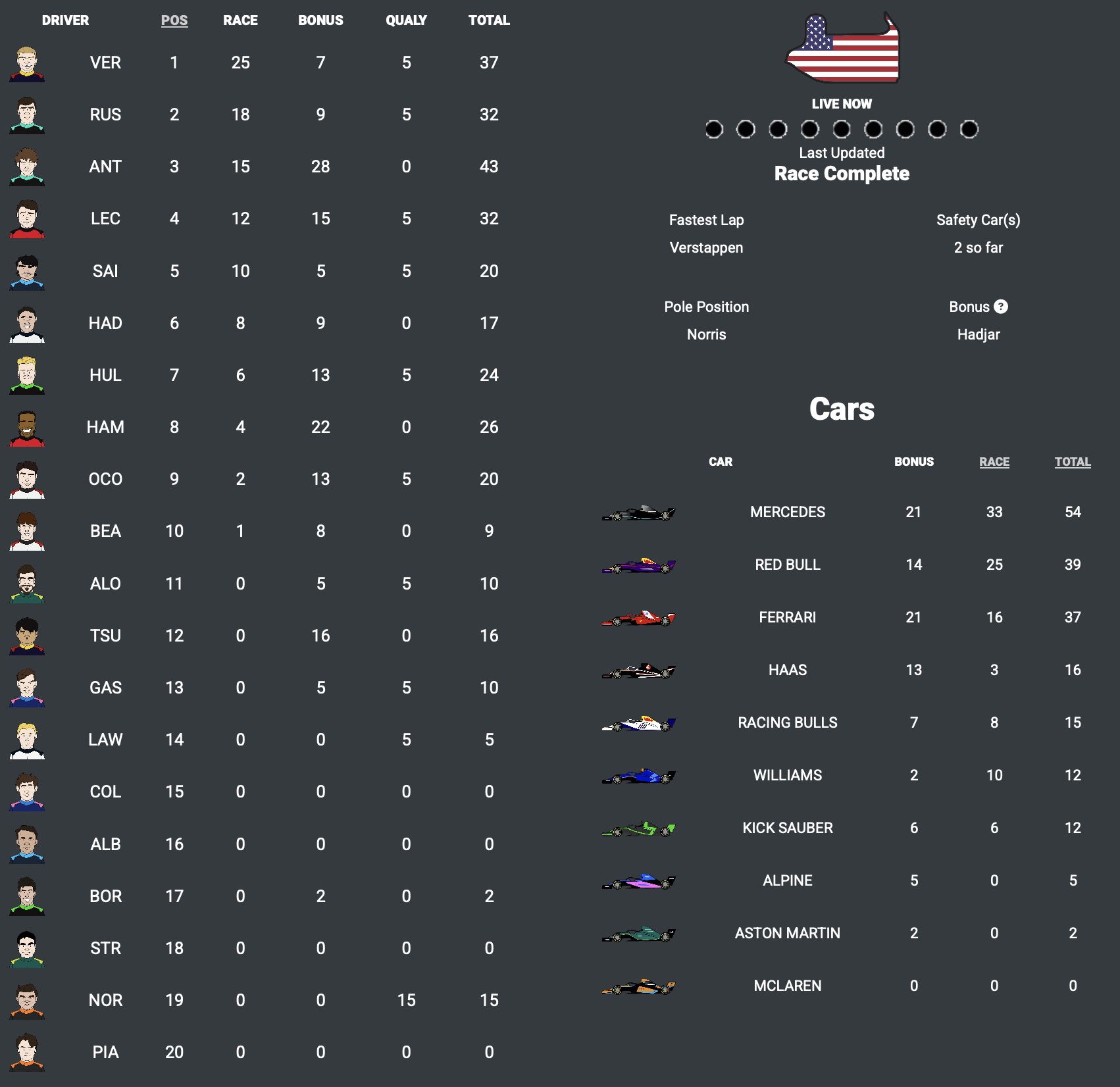 In Fantasy GP terms we had the podium or Verstappen, Norris and Russell with Verstappen also taking the Fastest Lap. Norris had Pole Position. During the race we had 2 safety car periods with two Virtual Safety Car appearances, following debris on the track. For the bonus question we asked which driver would finished highest of 3 rookies, which was Hadjar who had good run to P8.
